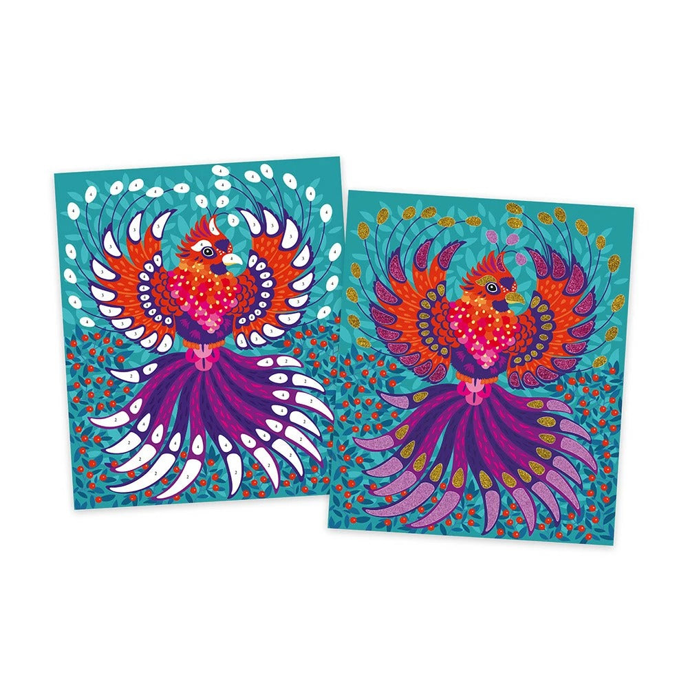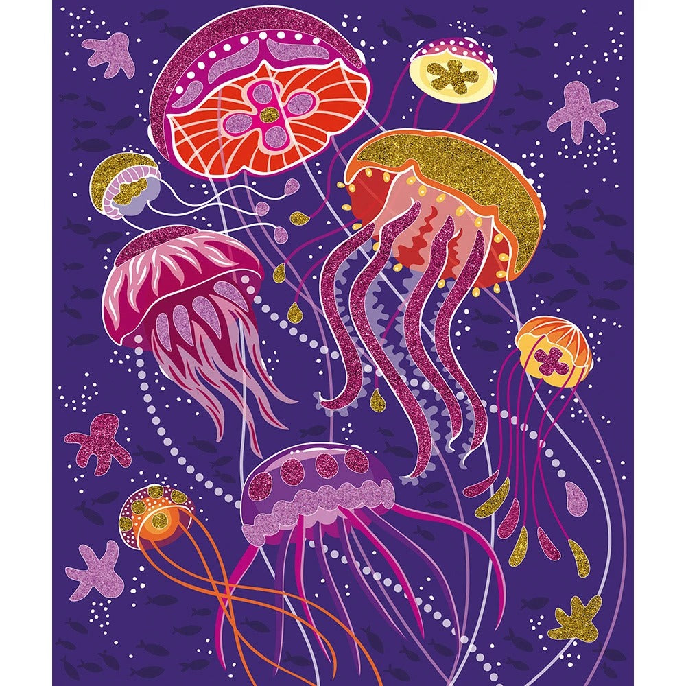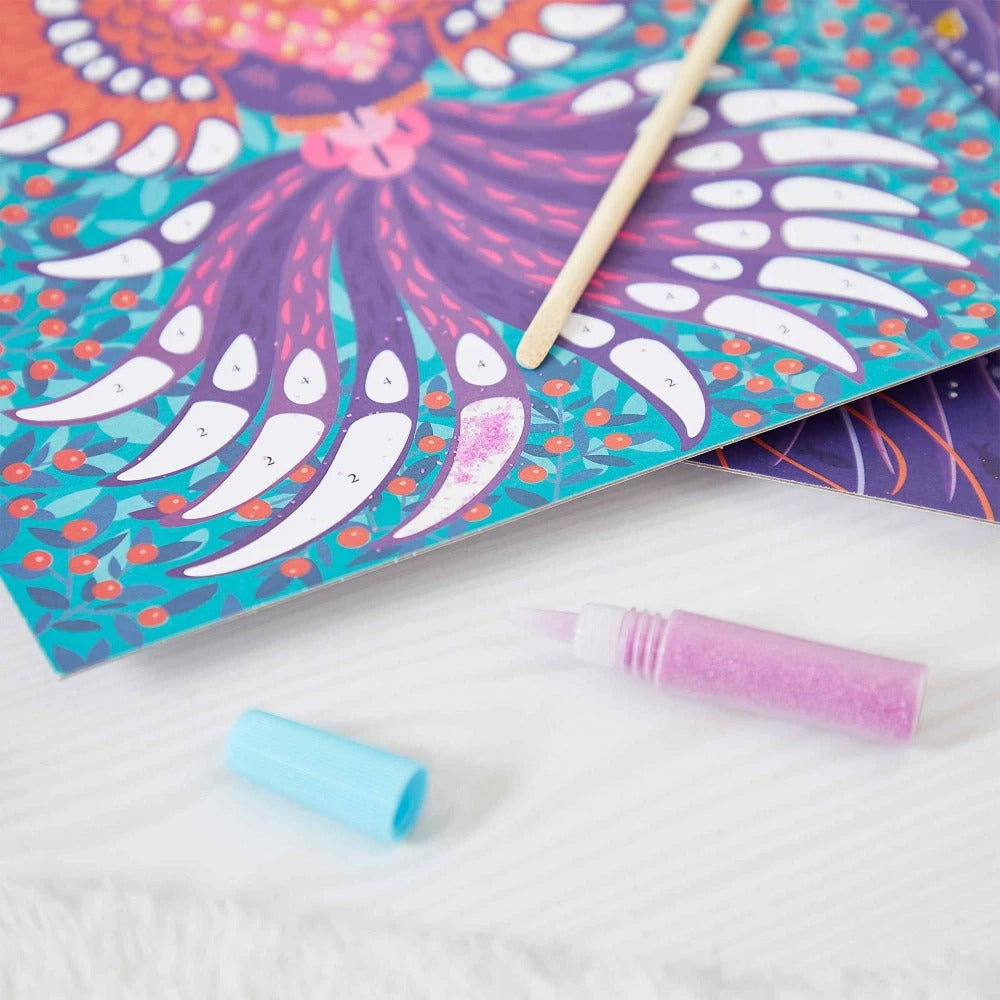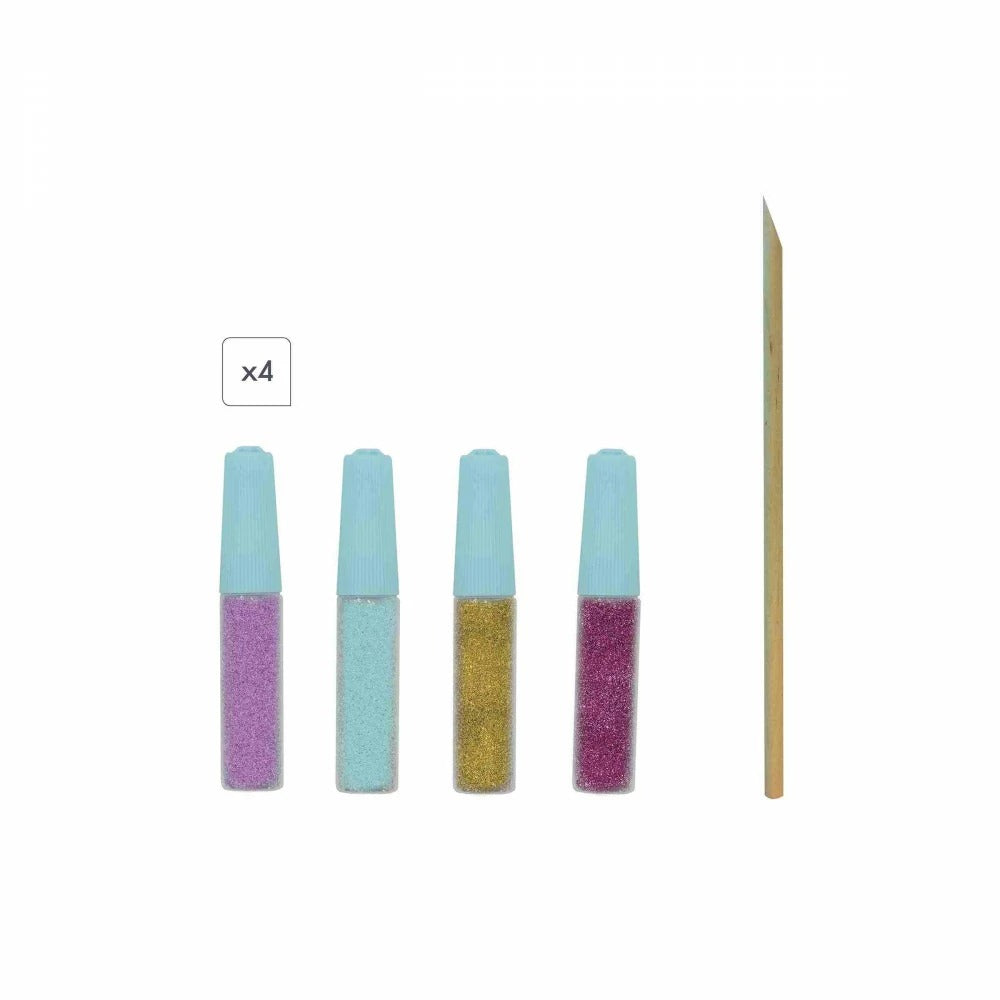 Este kit creativo permite a los niños a partir de 7 años decorar 5 cuadros con arena y purpurina: ¡brilla! Esta es una actividad manual que permite a los aprendices de artista desarrollar su paciencia, precisión y creatividad. Para hacerles compañía, hay animales misteriosos: un tigre majestuoso, un unicornio fantástico, una medusa poética, un fénix reluciente y un búho deslumbrante. El principio de este pasatiempo creativo es simple: ¡usando brillantina y arena biodegradables, los niños decoran las partes autoadhesivas de los cuadros para hacerlos brillar! Una vez brillantes, serán toda una sensación en la habitación de los niños. Sus tonos azules y morados les dan un lado místico y elaborado que gustará a los niños más mayores. Se imaginan en la oscuridad de una noche sin luna, o en las profundidades del mar en busca de especies enigmáticas. Esta caja creativa contiene: 5 tableros de pegatinas, 2 tubos de brillantina biodegradable, 2 tubos de arena y 1 herramienta de madera. Para guiar a los pequeños artistas a través de la actividad, se incluye un folleto con instrucciones y plantillas. Tardarás 30 minutos en decorar cada cuadro.