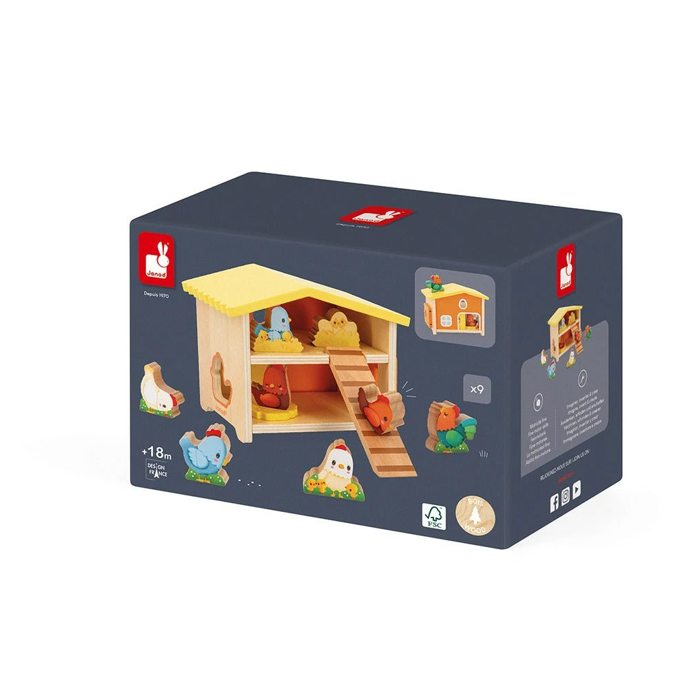 Amanece en la granja y el bebé, a partir de 18 meses, podrá empezar el día disfrutando de su gallinero de madera. Este juguete de estímulo con forma de casita lleva al pequeño al corazón de la granja gracias a los 9 accesorios incluidos. Este gallinero de juguete es ideal para estimular la imaginación y también la motricidad fina, ¡porque está lleno de sorpresas! De hecho, los animales pueden entrar por distintos sitios, como con una caja de formas: a través de una puerta corredera situada en la parte trasera del gallinero, por la puerta de bisagra con goma elástica del lateral, a través de un agujero con forma de gallina o incluso por la escalera desmontable. Algo nos dice que habrá mucho revuelo entre nuestras amigas las gallinas… El gallinero está compuesto por 6 gallinas, 1 gallo, 1 nido con huevos para incubar y 1 nido con un pollito. ¡Con este juguete de primera infancia, al bebé le esperan muchas aventuras en la granja! Anímale a encontrar a los pollitos, a colocar las figuras de madera en un lugar concreto del gallinero o incluso a describir lo que hace cada gallina para aprender aún más y pasar buenos ratos juntos. Este juguete para bebés está hecho de madera con certificado FSC™