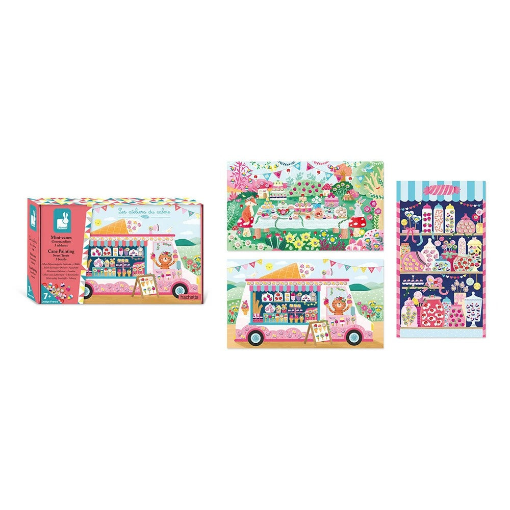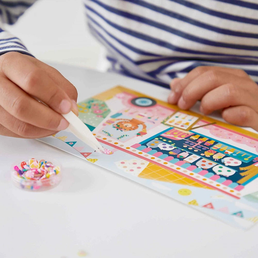 Gracias a esta caja creativa, los niños a partir de 7 años decorarán 3 cuadros con minibastones. ¡Estas pequeñas rodajas de arcilla polimérica en forma de frutas o pasteles se pegan en las tablas para darles aún más delicias! Para ello, los niños utilizan las pinzas proporcionadas y colocan los caramelos en los tableros de pegatinas: una actividad que fomenta la calma, la precisión y la expresión creativa. Este kit creativo incluye: 3 tableros de pegatinas, 370 minibastones en 8 modelos diferentes y 1 clip. Las instrucciones y modelos para reproducir están impresos dentro de la caja, para que los pequeños creativos puedan decorar sus cuadros de forma independiente. En el menú de estos ambientes gourmet, el tentador escaparate de una pastelería, un camión de helados (pero no sólo) y un banquete en el corazón del bosque a la hora del té: los niños añaden caramelos y galletas a la escena y a la magia. de delicias opera! Para decorar cada cuadro propuesto en este kit de ocio creativo, serán necesarios 15 minutos por ilustración. ¡Aquí tienes un dulce kit creativo!